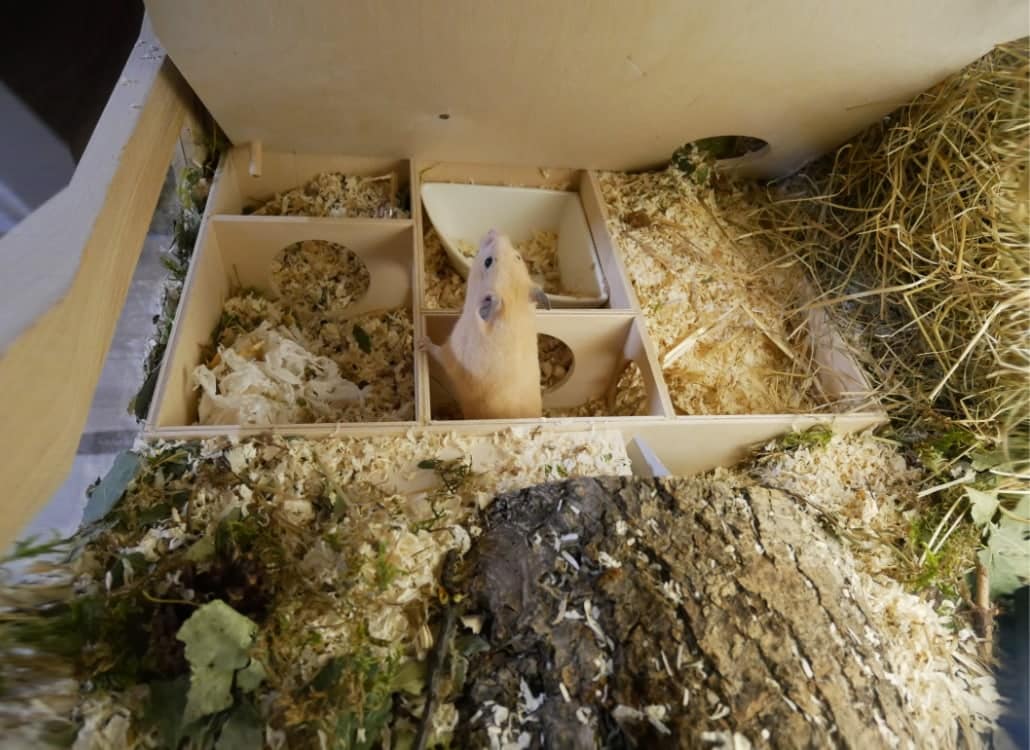 Ein Häuschen mit abnehmbaren Dach macht es leicht, die angehäuften Vorräte zu kontrollieren und die Futtermenge entsprechend anzupassen, um Übergewicht vorzubeugen.Idealgewicht beim Goldhamster